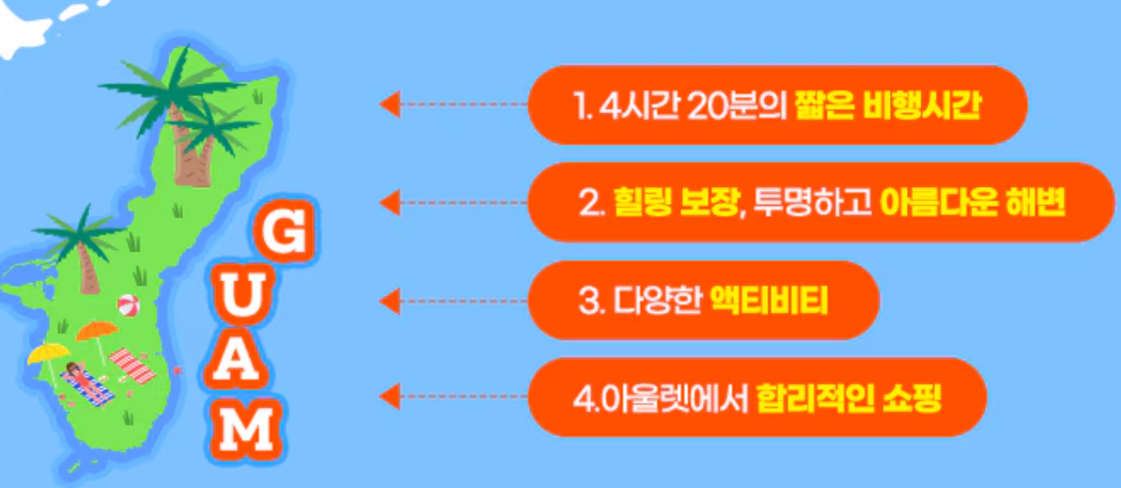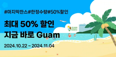 에메랄드 바다와 푸른하늘이 매력적인 휴양지 괌은 공항도착 후 시내 호텔까지 차량으로 10분이면 도착할 수 있는 특히 아이와 가족여행객들에게 매우 매력적인 휴가지입니다. 괌을 한번도 안가본 사람은 있지만, 한번만 가는 사람은 없다는 얘기처럼 나만의 힐링 여행지로 추천드리며, 이번 제주항공 괌 50% 특가 프로모션의 행운의 기회를 꼭 가지시길 바랍니다.