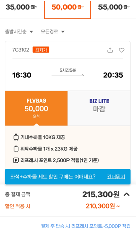 7)출발과 도착 항공권 모두 'FLY BAG' 이나, 위탁수화물1개, 23KG & 기내수화물 10KG 제공이 됩니다.