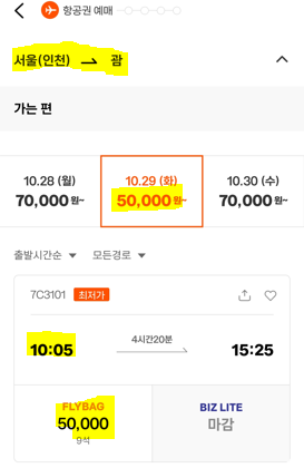 - 운항 정보 : 인천 => 괌 (7C3101 10:05 => 15:25) 괌 => 인천 (7C3102 16:30 => 20:35)