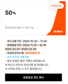 - 할인적용 채널 : 제주항공 공식 홈페이지 , 모바일웹 , App