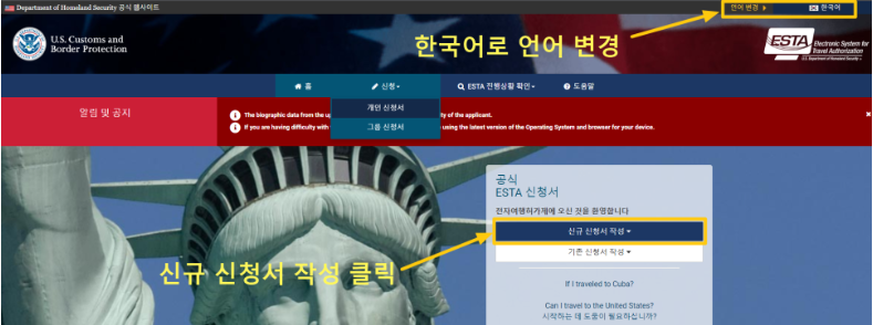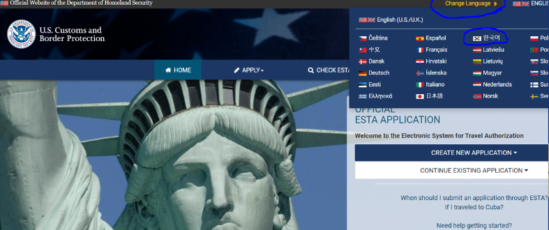 2) ESTA 신청 사이트에 접속 후 우측 상단의 "Change Language" 를 클릭하여 한국어로 변경합니다.