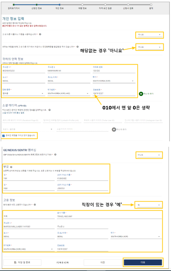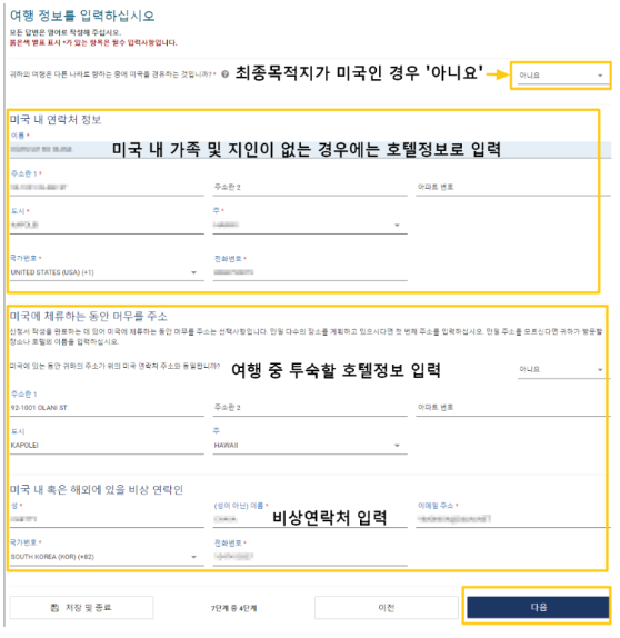 - 미국 내 주소 및 연락처(예약한 호텔 또는 지인 거주지, 연락처)