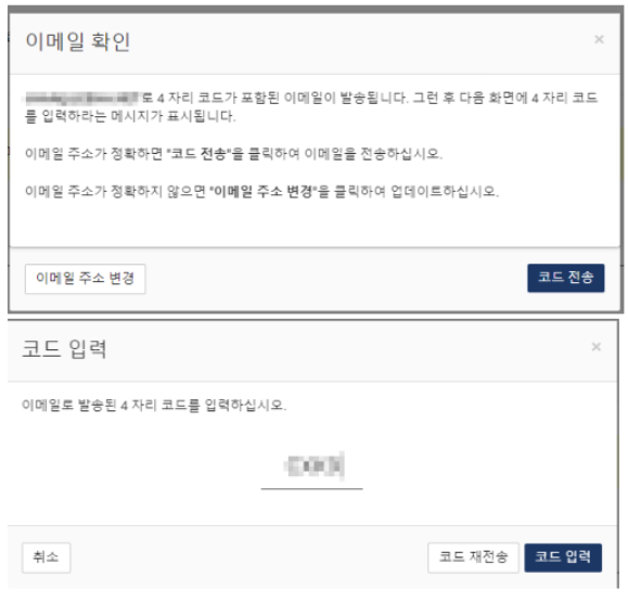 이메일은 본인이 주로 사용하는 유효한 계정을 기입하고, [코드전송] 버튼을 누르면, 기재한 이메일로 코드가 전송되어, 해당 코드를 입력합니다.