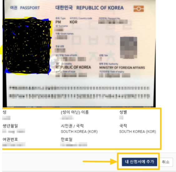 여권 업로드 버튼을 누르고, 내 PC에 있는 여권 이미지를 업로드 합니다.