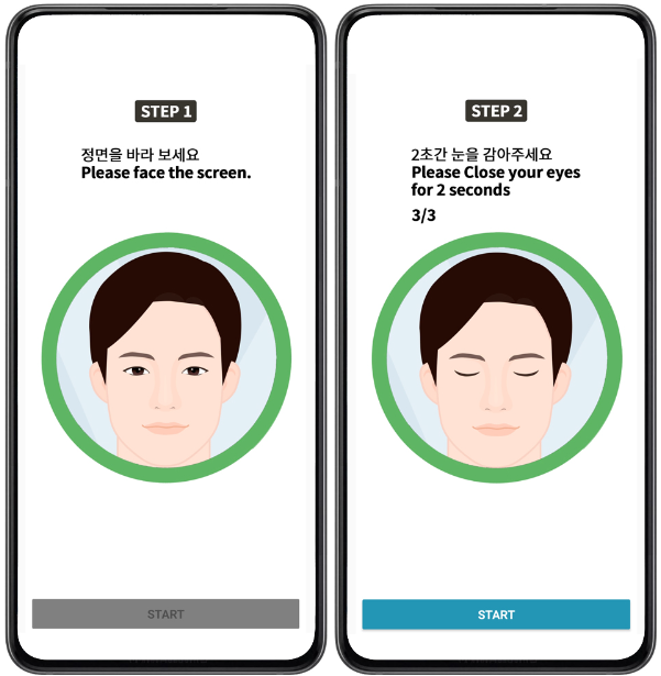 안내사항을 확인후 "START" 버튼을 누릅니다. 화면의 가이드에 맞춰 정면을 바라보면 자동으로 얼굴을 촬영합니다. 이어서 위변조 확인을 위해 눈을 감습니다. 촬영이 완료되면 짧은 진동이 울립니다.