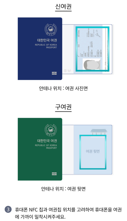 - 아이폰의 경우, 후면 상단부에 NFC칩이 있어 핸드폰을 살짝 기울여 상단면과 여권을 밀착하여 스캔하면 인식 확률이 높습니다.