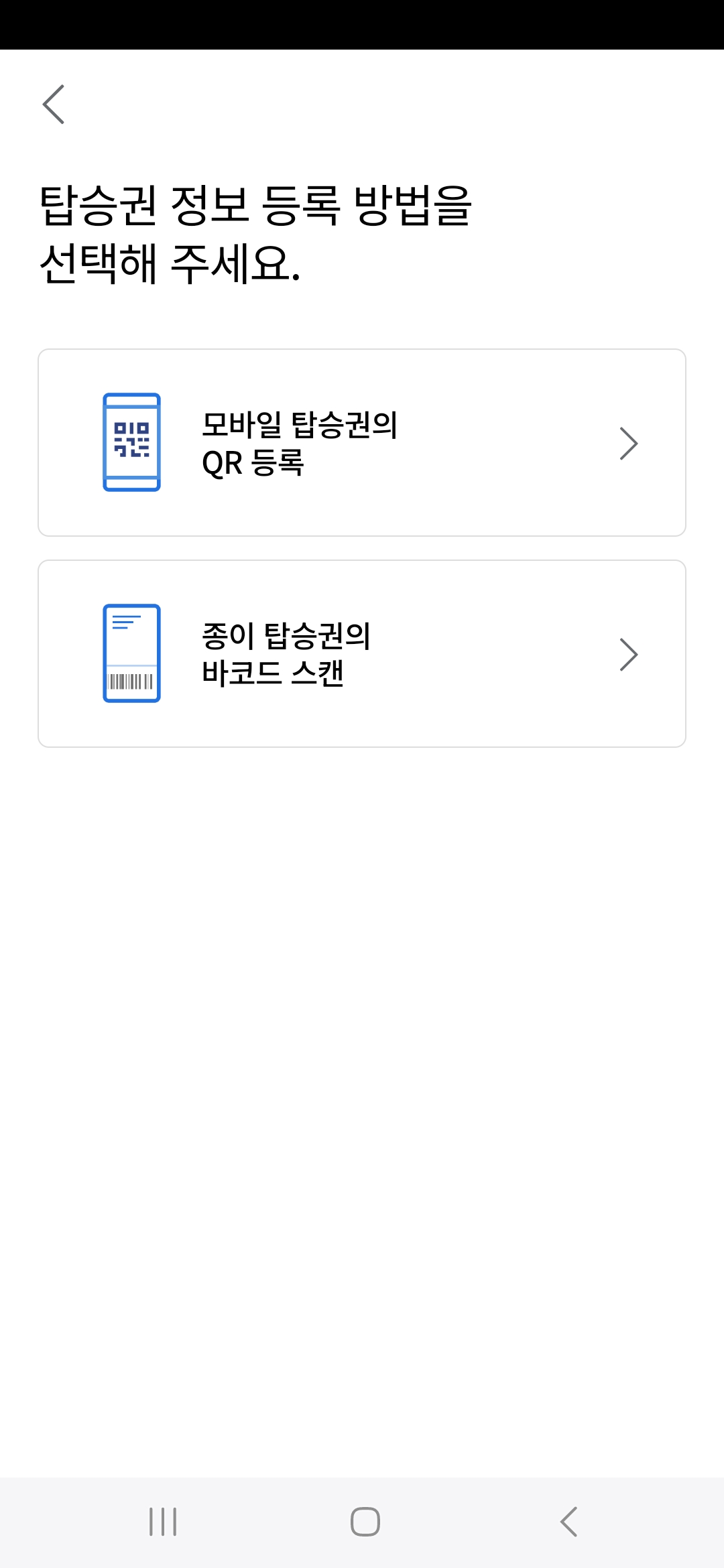- 소지하신 종이 탑승권의 바코드를 스캔 화면에 맞춰 가로로 위치시킵니다.유효한 탑승권일 경우, 등록이 완료 됩니다.