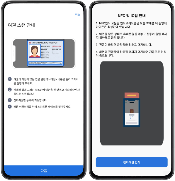다음으로 ID 등록단계인 여권스캔 - 여권 전자칩 스캔 - 얼굴인증 단계를 시작합니다.