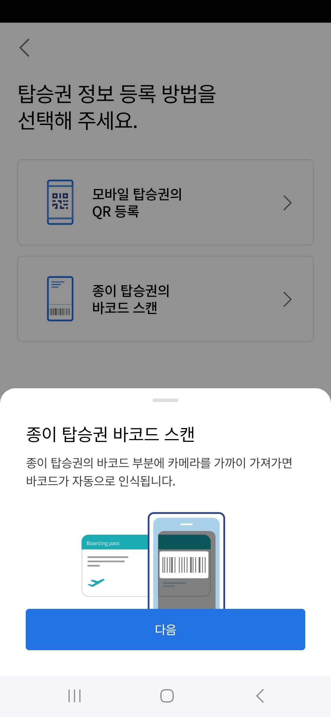 - "종이 탑승권의 바코드 스캔" 버튼을 누릅니다.