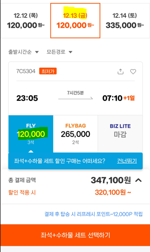 6. 귀국일 12월 13일을 선택하였고, 편도 요금은 120,000원으로 출발일과 동일합니다.
