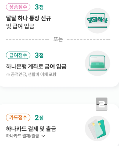 - 하나은행 통장 신규 가입 및 급여입금 또는 하나은행 계좌로 급여 입금(3점)