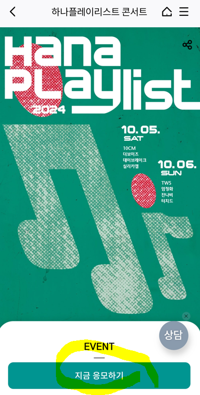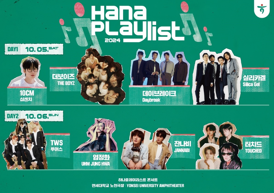 하나은행이 주최하는 '하나플레이리스트 콘서트'가 10월5일,6일 연세대 노천극장에서 개최됩니다. 5일에는 10CM, 더보이즈, 데이브레이크, 실리카겔이, 6일에는 TWS, 엄정화, 터치드, 잔나비가 출연합니다. 콘서트의 티켓은 일반 예매처가 아닌, 티켓응모 이벤트를 통한 추첨으로 무료로 제공되며, 당첨의 기회는 아래글을 통해서 주인공이 되실 수 있습니다.