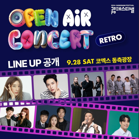강남의 대표 문화축제인 2024 강남페스티벌이 코엑스를 중심으로 공연, 전시, 버스킹, 심야영화제 등 다양한 프로그램으로 9월 26일(목)부터 4일간 29(일) 개최됩니다. 그 중 7080을 위한 90년대 우리의 마음을 흔들었던 가수들이 한데모여 오픈에어콘서트 레트로를 개최합니다. 공연관람은 무료이며, 사전예매는 선착순 마감이라 빠르게 티켓팅하시기 바랍니다.