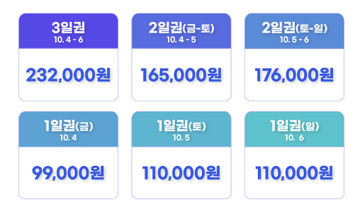 - 3일권 손목밴드는 3일차 일정이 모두 종료될 때까지 분실 및 훼손 없이 착용하고 계셔야 재입장이 가능합니다. (2일권도 동일)