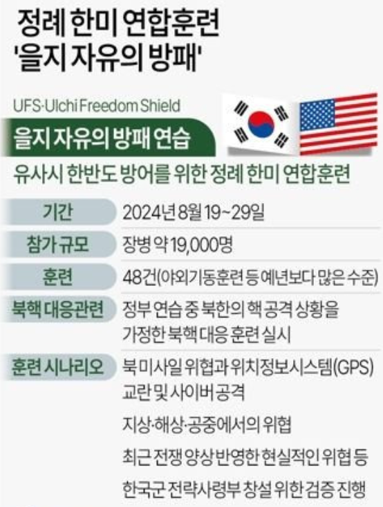 한미 군당국은 8월 19일 부터 29일까지 을지 자유의 방패(UFS·을지프리덤실드) 연습을 시행합니다. 지난해 대비 한미 연합 야외기동훈련을 더욱 확대하여 북 도발 시 '즉강끝' 원칙으로 태세를 높인다고 합니다. 을지 자유의 방패연습은 유사시 한반도를 방어하기 위한 한미 연합 훈련입니다. 약 열흘간 시행되는 민관군 연합 훈련에 대한 일정을 알아보겠습니다.